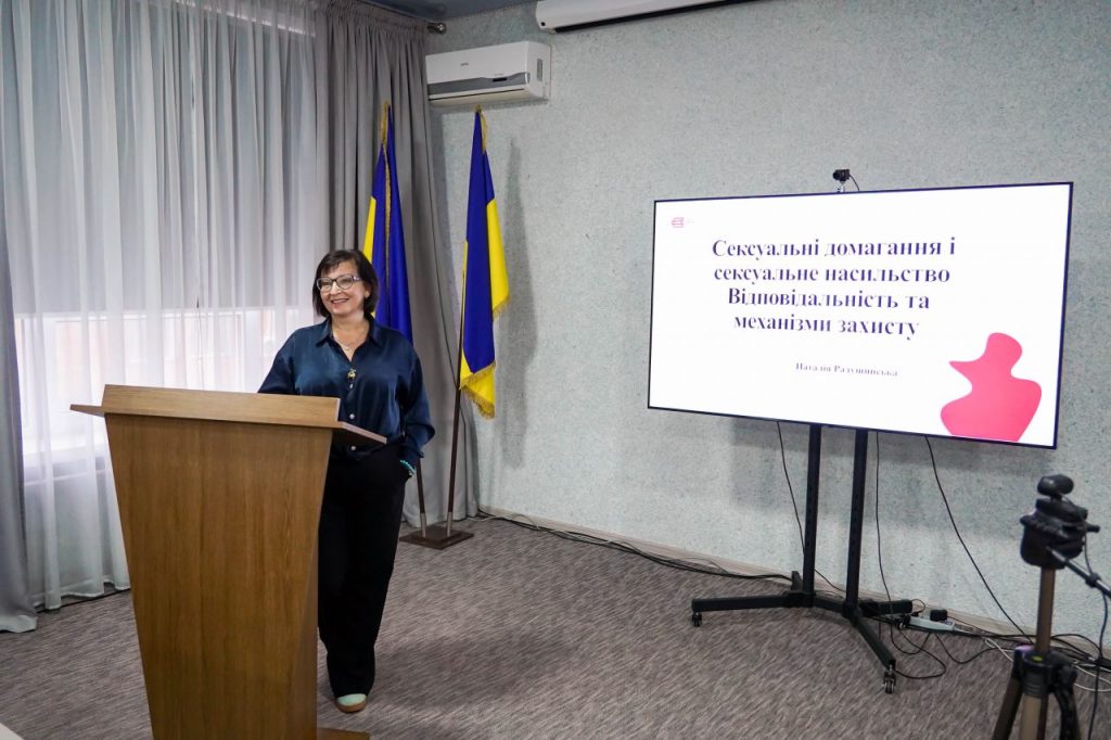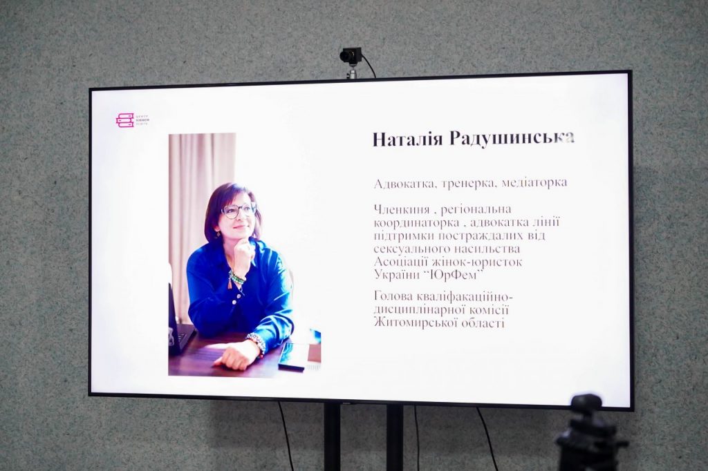 Лекцію провела Наталія Радушинська— голова Кваліфікаційно-дисциплінарної комісії адвокатури Житомирської області, адвокатка, тренерка, регіональна координаторка Асоціації жінок-юристок України «ЮрФем».