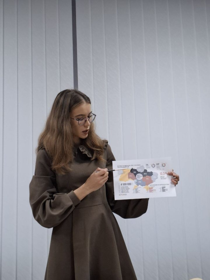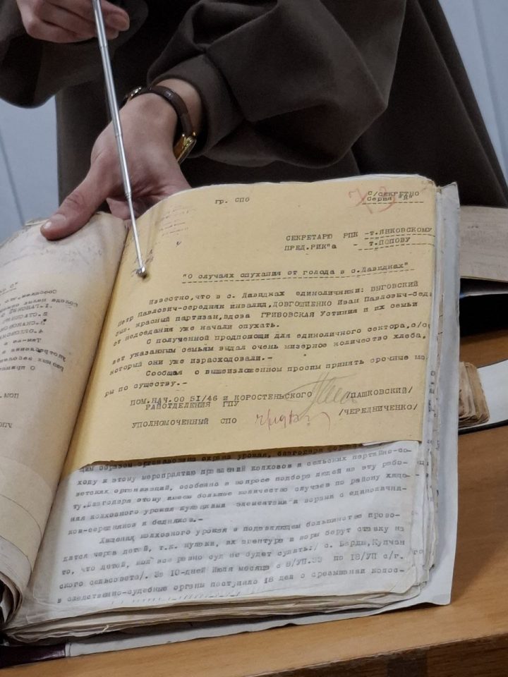 Лекцію провела головний спеціаліст Державного архіву Житомирської області Олександра Горпинич, яка не лише розповіла про історичний контекст геноциду, а й продемонструвала унікальні оригінали документів, що десятиліттями зберігалися під грифом «Цілком таємно».