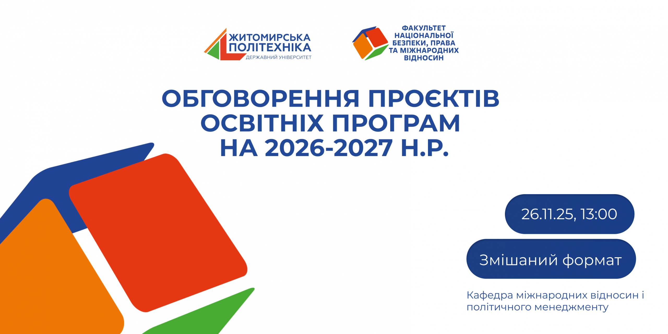 Кафедра міжнародних відносин і політичного менеджменту Житомирської політехніки запрошує стейкхолдерів, роботодавців, представників бізнесу, влади, науковців, здобувачів освіти та всіх бажаючих до обговорення освітніх програм всіх рівнів освіти за спеціальностями «Економіка та міжнародні економічні відносини», «Міжнародні відносини» та «Політологія» на 2026-2027 н.р.
