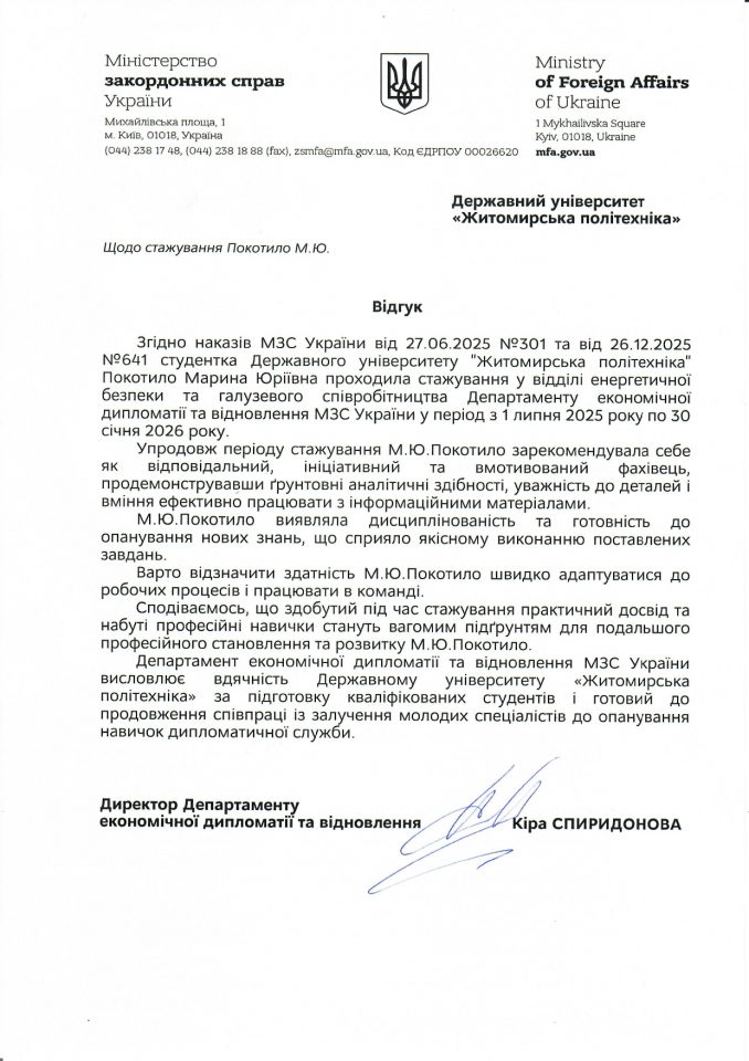 Студентка Державного університету «Житомирська політехніка» Марина ПОКОТИЛО (група МЕ-8, 4 курс, ОПП «Міжнародні економічні відносини»),  успішно пройшла стажування в Міністерстві закордонних справ України. Стажування тривало у період з 1 липня 2025 року по 30 січня 2026 року та відбувалося у відділі енергетичної безпеки та галузевого співробітництва Департаменту економічної дипломатії та відновлення МЗС України.