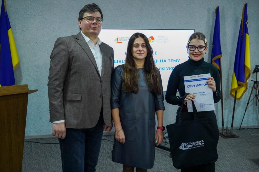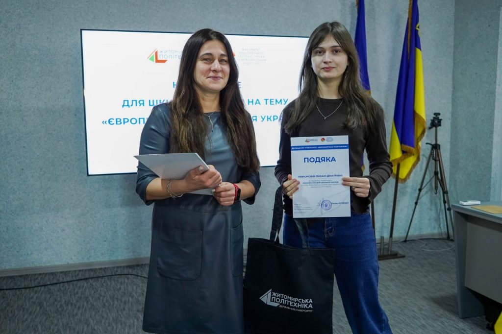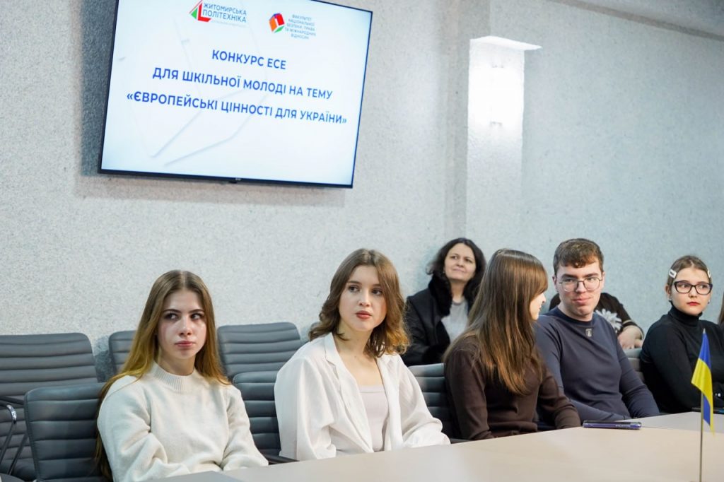 28 лютого 2026 року в Державному університеті «Житомирська політехніка» відбулося нагородження учасників Конкурсу есе для шкільної молоді на тему «Європейські цінності для України», організованого на базі факультету національної безпеки, права та міжнародних відносин.